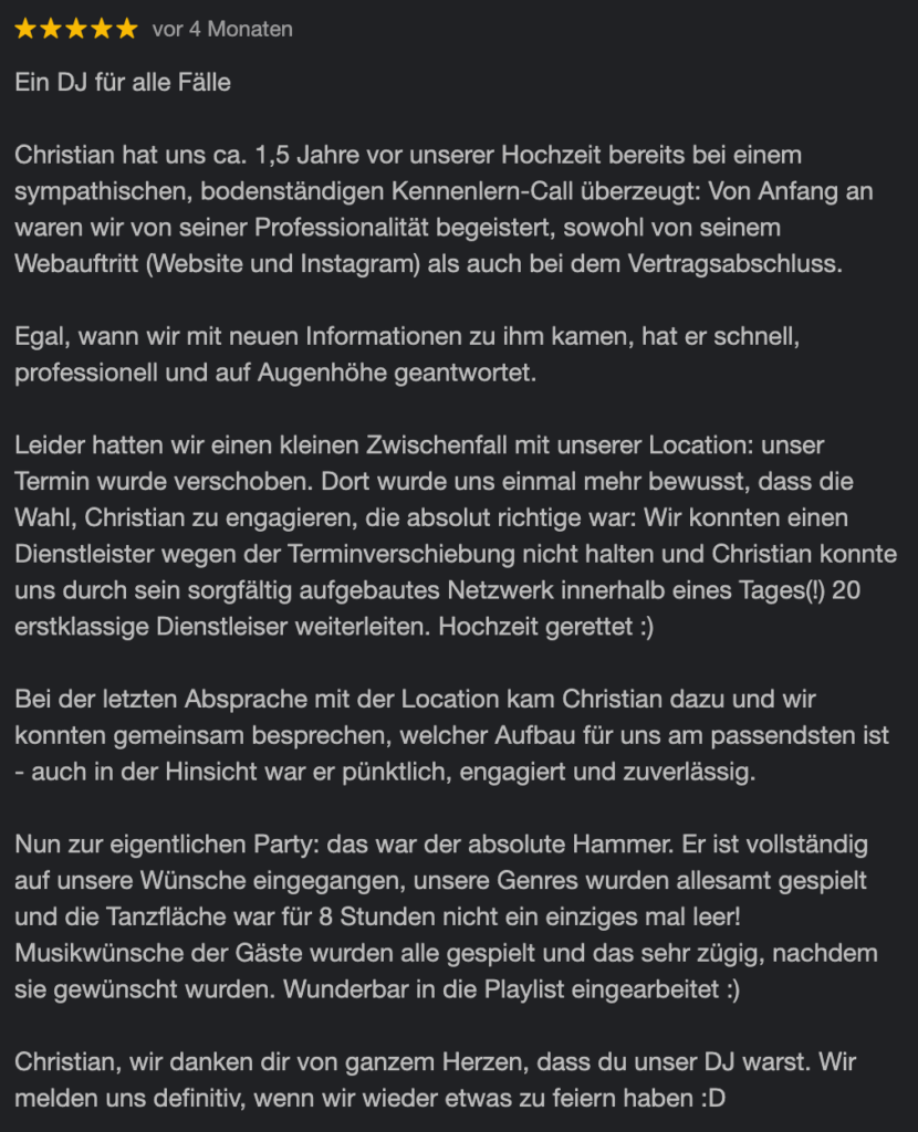 Keine Schlagerplaylist von der Stange, sondern anspruchsvolle Partymusik, individuell für eure Feier kuratiert.