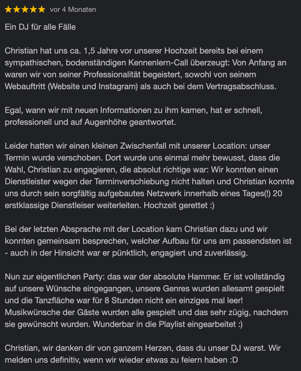 Ich liefere keinen Standard-Mix, sondern den individuellen Soundtrack für eine Nacht, von der ihr noch lange schwärmen werdet.